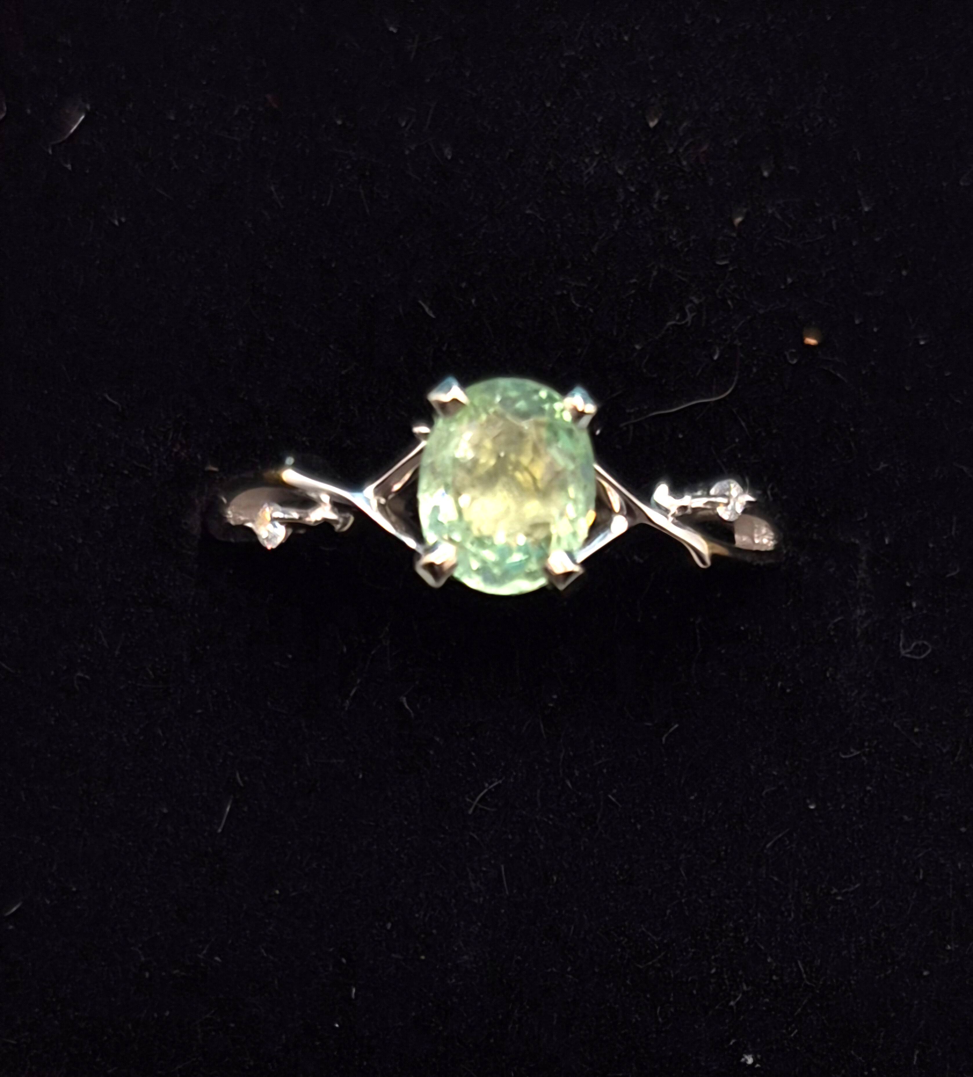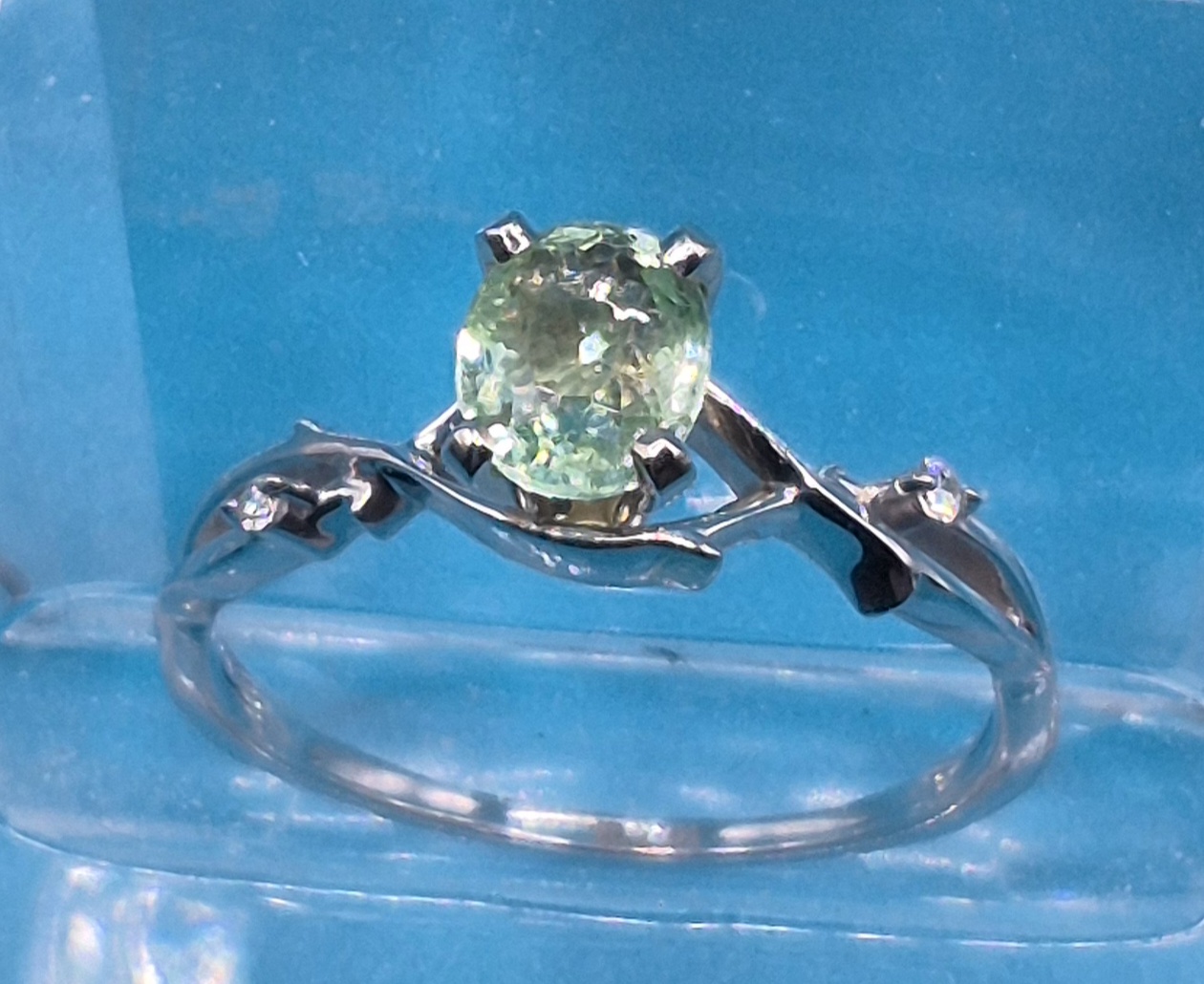 Natural copper bearing 0.76ct Paraiba Tourmaline with 2 small diamonds set in 14k White gold, size 7.