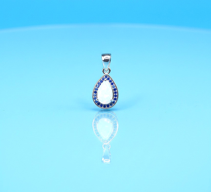 Lovely pear shaped White Opal and Blue Sapphire pendant set in 925 Sterling Silver…measures 1/2 x 3/4 inch…chain not included